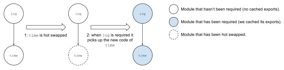 Cuando se requiere log, el runtime almacenará en caché sus exportaciones y las de time (paso 1). Si luego modificas time, el proceso HMR no puede finalizar simplemente reemplazando el código de time. Si lo hiciera, cuando se ejecute log, usaría la copia en caché de time (código antiguo).