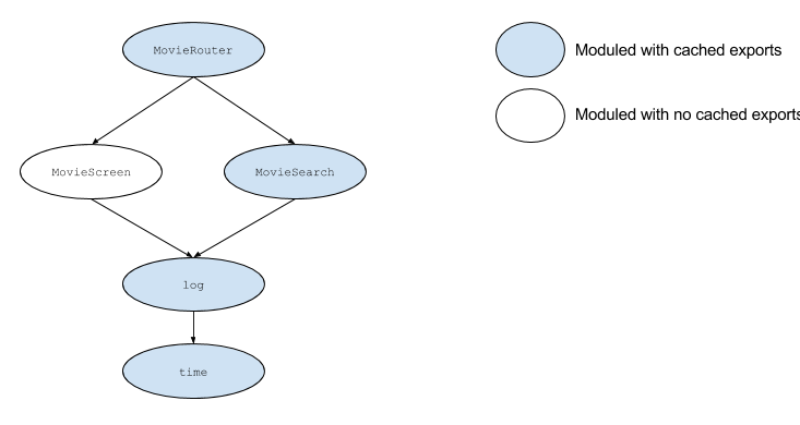 Jeśli użytkownik odwiedzi widok wyszukiwania filmów, ale nie drugi widok, wszystkie moduły oprócz MovieScreen będą miały buforowane eksporty. Przy zmianie w module time, środowisko wykonawcze musi wyczyścić eksporty log by uwzględniło zmiany w time. Proces się tu nie kończy: środowisko rekursywnie powtórzy tę operację aż do zaakceptowania wszystkich modułów nadrzędnych. Pobierze moduły zależne od log i spróbuje je zaakceptować. Dla MovieScreen może przerwać (nie był jeszcze wymagany). Dla MovieSearch wyczyści eksporty i rekursywnie przetworzy jego moduły nadrzędne. Na koniec zrobi to samo dla MovieRouter i zakończy proces (żaden moduł od niego nie zależy).