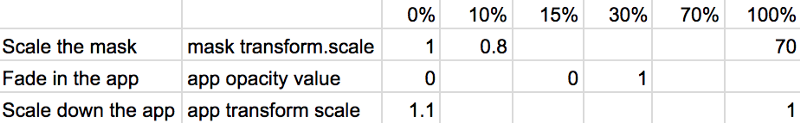 Podczas powiększania maski zwiększamy przezroczystość warstwy aplikacji, odsłaniając ją i ukrywając białą warstwę pod spodem. Na koniec efektu: warstwę aplikacji początkowo skalujemy do rozmiaru >1, a następnie zmniejszamy do 1 pod koniec animacji. Potem ukrywamy warstwy nie-aplikacyjne, bo nie będą już widoczne.