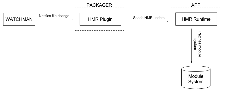 热重载基于 模块热替换(HMR)功能构建。该技术由 webpack 首创,我们在 React Native Packager 中实现了它。HMR 让 Packager 监听文件变更,并向应用内嵌的轻量 HMR 运行时发送更新