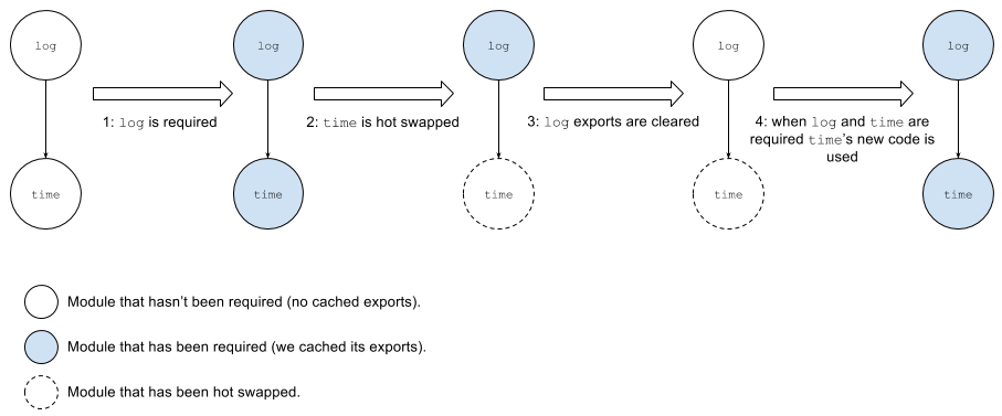 当 log 被引入时,运行时将缓存其导出值及 time 的导出值(步骤1)。若此时修改了 time 模块,热更新流程不能仅替换完 time 的代码就结束。否则当 log 执行时,它仍会使用缓存的旧版 time 代码。