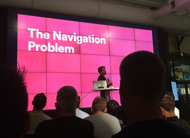 Leland 演讲的后半段聚焦于 React Native 的核心痛点:导航解决方案。他剖析了丰富的导航库生态(包括官方和第三方方案),特别提到 NavigationExperimental 看似前景广阔,最终却未能满足其实际需求。